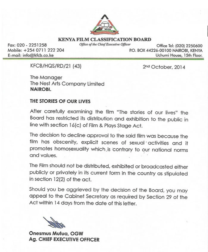 On 3rd October, we received communication that the Kenya Film Classification Board has restricted the distribution and exhibition of Stories of Our Lives to the public in line with section 16(c) of the Film and Stage Plays Act (download as PDF). This, because the film “has obscenity, explicit scenes of sexual activities and it promotes homosexuality which is contrary to our national norms and values”.
